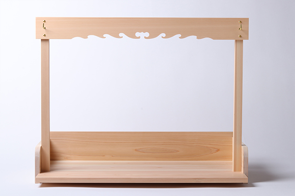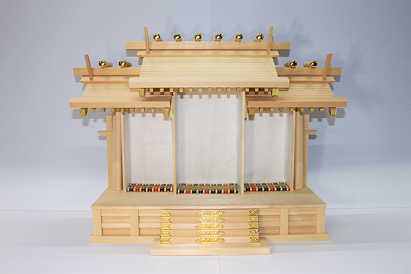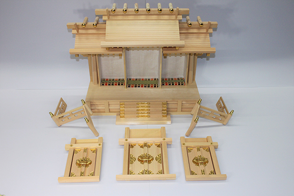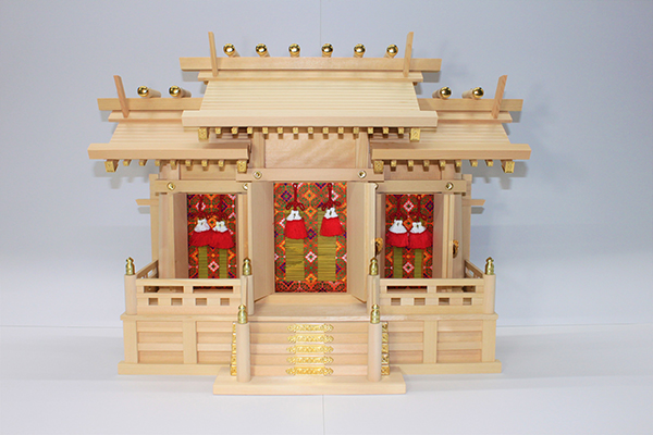 通し屋根三社 唐⼾造り + 神具5 点セット(大)+ 簡易袖板付き棚板(特々大)雲板欄間付き