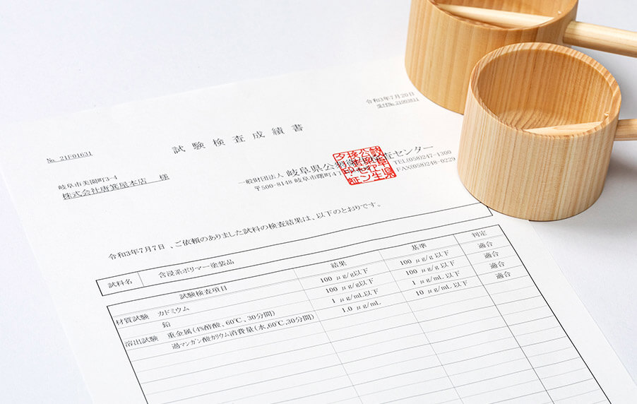 表面仕上げに使用したポリマー塗料については、財団法人岐阜県公衆衛生検査センターでの試験により安全性が実証されています。