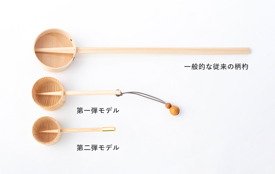 全国屈指のヒノキの生産地である岐阜県東濃地方を中心に産出されるヒノキの銘木「東濃桧(とうのうひのき)」を使用しています。従来型の柄杓では、水を汲み上げる丸い部分は一般的に曲げわっぱという特殊な技術で製作されていますが、この柄杓は1本の木を旋盤で削り出して円形の器を造る技術 「挽物(ひきもの)」で製作しています。