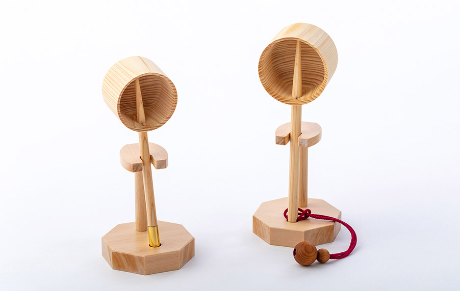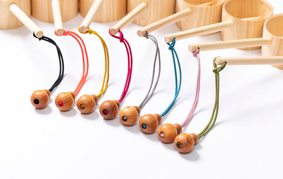 第一弾モデル「手水日和」では、柄杓の持ち手にこだわりの根付ストラップを取り付けました。根付部分の直径Φ2.5cmの木珠は、岐阜県の県木にもなっているイチイの木を使用。紐は、水にぬれても色落ちしにくい素材でカラーバリエーションは全8色となります。