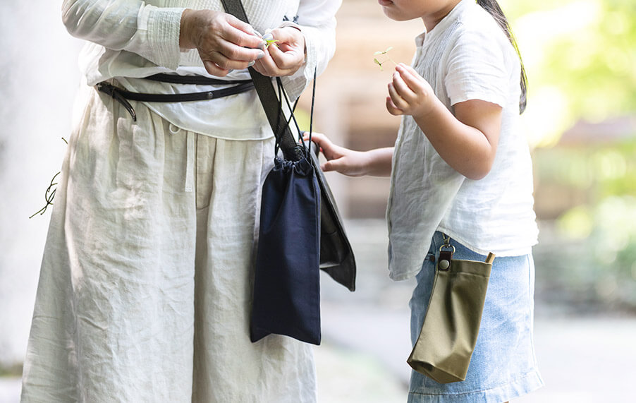 マイひしゃくを⻑く愛用していただくために、生地にもこだわった手軽で丈夫な巾着袋と持ち運びに便利なナスカン付きポーチの2種類をご用意致しました。